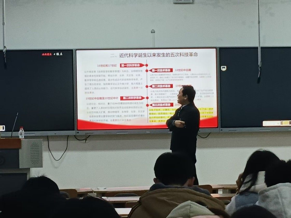 赵向南站长长期关注国家科技政策与创新发展动态,具有深厚的理论素养和丰富的新闻实践经验。讲座中,他紧密结合四中全会《决定》精神,系统梳理了全会对科技创新工作提出的新论断、新要求、新任务,从四个方面进行了深入讲解。一是提醒同学注意科学与技术的区别,科学以回答“是什么”“为什么”为任务,旨在揭示自然规律;技术则聚焦“做什么”“怎么做”,目标是改造自然以满足社会需求。二是梳理了近代科学诞生以来的五次科技革命脉络,分析第六次科技革命的发展趋势,并结合“科技兴则民族兴,科技强则国家强”的深刻内涵,阐述了科技创新对民族复兴、国家强盛的关键作用。